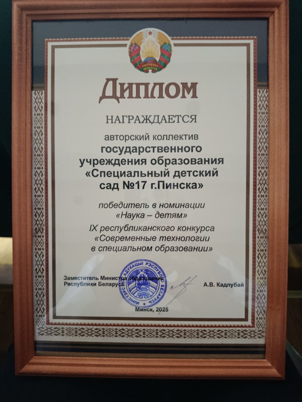 Авторский коллектив ГУО «Специальный детский сад №17 г.Пинска» в составе: Базан Марина Ивановна, учитель-дефектолог, Гришко Ольга Владимировна, воспитатель дошкольного образования, Дубинец Анна Леонидовна, воспитатель дошкольного образования, одержал победу в номинации «Наука -детям». Тема работы: «Арт-экспериментирование как средство формирования естественно-научных представлений у обучающихся с трудностями в обучении».